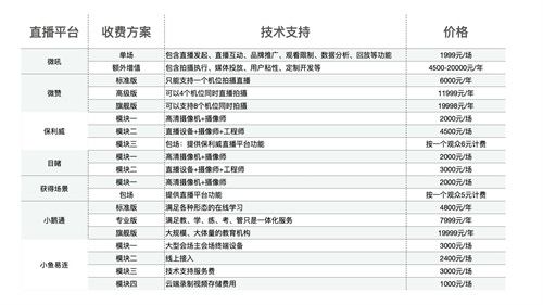 直播平台把企业的需求从简单到复杂分成几类套餐,供企业选择。(一般企业直播的需求都在套餐范围内,从直播时长、次数以及实现效果,都有清晰标注。)