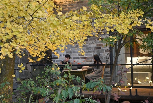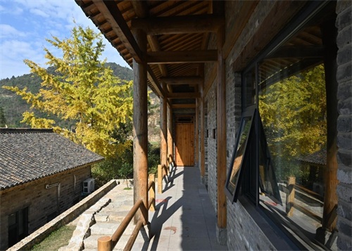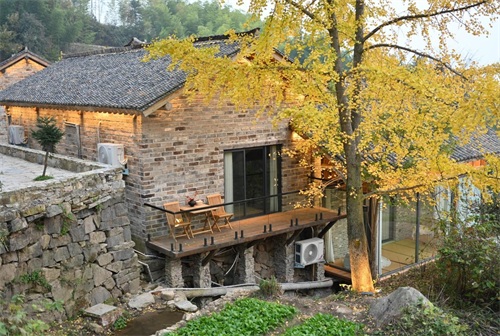 青砖黛瓦,木柱连廊,竹海掩映处,磨盘山村彭湾组依山而建的8套老旧村居小院,经过民宿建筑师们的精心雕琢,终于脱胎换骨,在秋日斑斓群山映衬下,愈发显得幽雅古朴、清新脱俗。