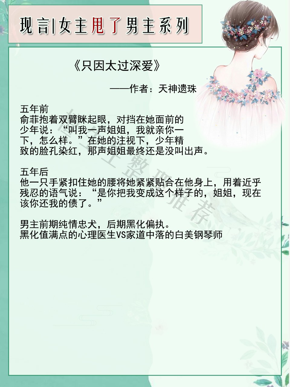 简评:黑化值满点的心理医生和家道中落的白美钢琴师破镜重圆的故事。姐弟恋,女大男三岁。
