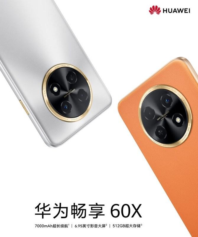 外观:华为畅享 60X 手机有银色、橙色两款配色,橙色为素皮后盖,后置圆盘镜头模组,模组外围还包有一圈金边。