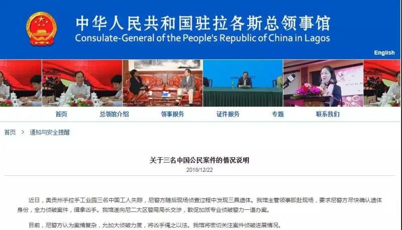 中国驻拉各斯总领馆网站12月22日消息,近日,奥贡州手拉手工业园三名中国工人失踪,尼警方随后现场侦查过程中发现三具遗体。我馆主管领事即赴现场,要求尼警方尽快确认遗体身份,全力侦破案件,缉拿凶手。我馆遂向尼二大区警局局长交涉,敦促加派专业侦破警力一道办案。