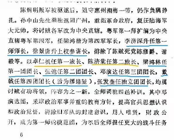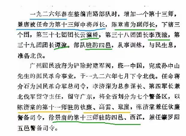 【图1,凌仲冕《再述陈济棠》(《广州文史资料存稿选编 第4辑 军政类》第375—415页):军,李济深任军长;以原民军的福军编为第5军,李福林任军长;以鄂军和其他部队编为第6军,程潜任军长;(华697注,程潜的第6军是湘军,不是鄂军,)稍后以广西部队编成第7军,李宗仁任军长。在广州誓师北伐时,在粤出发的是1至6军,第7军是由桂出发的。迄第4军前锋叶挺团进入了湖南,所向无敌。唐生智所部始编为第8军而任军长。这是北伐大军初期的8个军,克武汉后,蒋介石陆续收编各地的降军散军,才扩充至二十多个军。第4军所属的3个师是陈铭枢当师长,张发奎当第12师师长,陈济棠当第11师长。(华697注:第四军是四个师,还有徐景唐任师长的第13师;北伐初期第12师师长是陈可钰,张发奎是第12师副师长,)当时李济深是当国民革命军的总参谋长而兼任第4军军长,负责留守任务,巩固后方,随同蒋介石出发的只是副总参谋长白崇禧。(华697注:李宗仁说,白崇禧是北伐军参谋长兼任副总参谋长,代行总参谋长职权;李济深只是留守广州,都还得听蒋介石左右摆布,)第四军出发的只第10和第12两个师,第11师留守广东、(华697注:留守广东的还有第13师。)