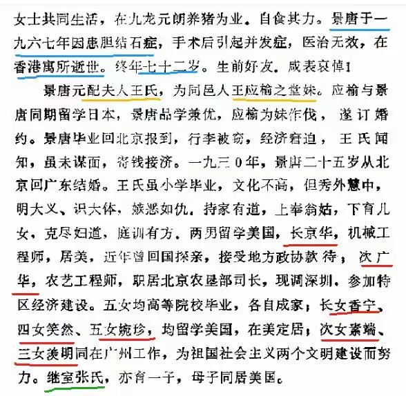 景唐原配夫人王氏,为同邑人王应榆之堂妹。应榆于景唐同期留学日本,景唐品学兼优,应榆为妹作伐,遂订婚约。景唐毕业回北京报到,行李被窃,经济窘迫,王氏闻知,虽未谋面,寄钱接济。一九三0年,景唐二十五岁从北京回广东结婚。王氏虽小学毕业,文化不高,但秀外慧中,明大义,识大体,嫉恶如仇,持家有道,上奉翁姑,下育儿女,克尽妇道,庭训有方,两男留学美国,长京华,机械工程师,居美,近年曾回国探亲,接受地方政协款待;次广华,农艺工程师,职居北京农垦部司长,现调深圳,参加特区经济建设。五女均高等院校毕业,各自成家,长女香宁,四女笑然,五女婉珍,均留学美国,在美定居;次女素端,三女羡明同在广州工作,为社会主义两个文明建设而努力。继室张氏,亦育有一子,母子同居美国。】