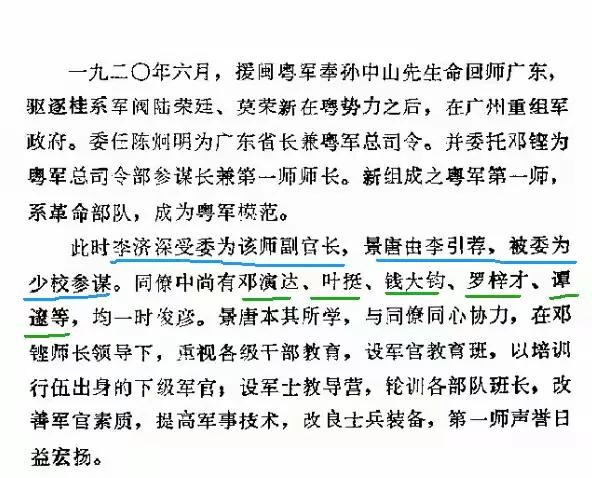 此时李济深受委托为该师副官长,景唐由李引荐,被委为少校参谋,同僚尚有邓演达,钱大钧,罗梓才,谭邃等,均一时俊彦。景唐本其所学,与同僚同心协力,在邓铿师长领导下,重视各级干部教育,设军官教育班,以培训行伍出身的下级军官;设军士教育营,轮训各部队班长,改善军官素质,提高军事技术,改良士兵装备,第一师声誉日益宏扬。】