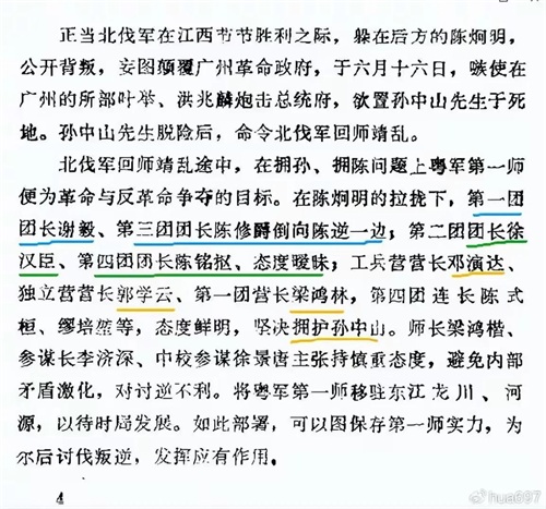 北伐军回师靖乱途中,在拥孙,拥陈问题上粤军第一师便为革命与反革命争夺的目标。在陈炯明的拉拢下,第一团团长谢毅,第三团团长陈修爵倒向陈逆一边;第二团团长徐汉臣,第四团团长陈铭枢,态度暧昧;工兵营营长邓演达,独立营营长郭学云,第一营长梁鸿林,第四团连长陈式桓,缪培堃等,态度鲜明,坚决拥护孙中山。师长梁鸿楷,参谋长李济深,中校参谋徐景唐主张持慎重态度,避免内部矛盾激化,对讨逆不利。将粤军第一师移驻东江龙川,河源,以待时局发展。如此部署,可以图保存第一师实力,为尔后讨伐叛逆,发挥应有作用。】