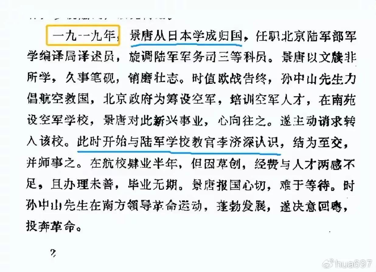【图21,《东莞文史资料选辑 第12辑》第2—26页“徐景唐传”:一九一九年,景唐从日本学成归国,任职北京陆军部军学编译局译述员,旋调陆军军务司三等科员。景唐以文牍非所学,久事笔砚,销磨壮志。时值欧战告终,孙中山先生力倡航空救国,北京政府为筹设空军,培训空军人才,在南苑设空军学校,景唐对此新兴事业,心向往之。遂主动请求转入该校。此时开始与陆军学校教官李济深认识,结为至交,并师事之。在航校肄业半年,但因草创,经费与人才两感不足,且办理未善,毕业无期。景唐报国心切,难于等待。时孙中山先生在南方领导革命运动,蓬勃发展,遂决意回粤,投奔革命。】